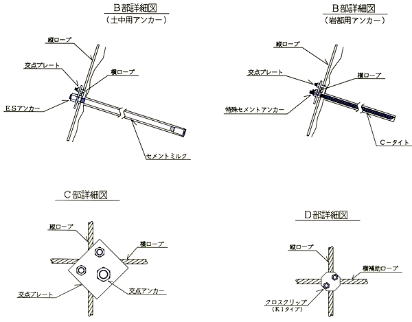 立木を残しワイヤーロープを、格子状に設置します。最小限の支障木(小木・雑木)の伐採及び草類の刈り取り程度で施工ができ、自然を残せます。 - 斜面が安定します