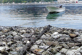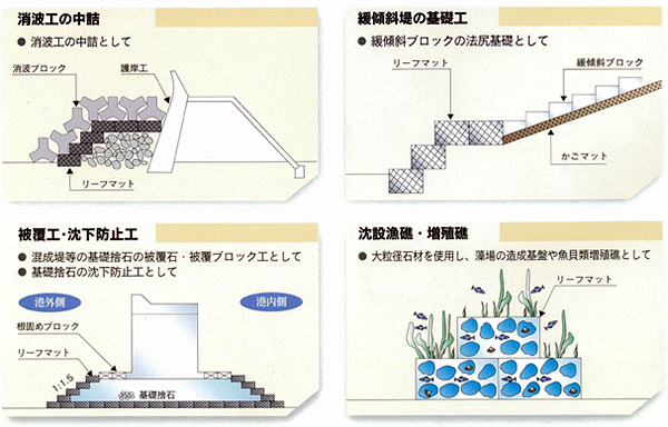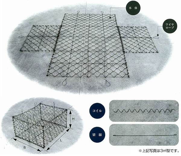 リーフマットとは、特殊ポリエチレン被覆線材を使用し、従来製品に比べて耐久性や強度などに優れたかご製品です。