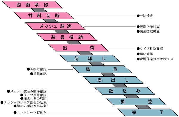 当社の厳重なる品質管理のもとに於て、製作される為、加工時に於けるピッチ・定着長が確保されコンクリート打設時の配筋の乱れがなくなります。