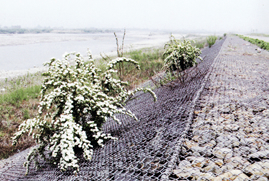 かごの線材には耐蝕性の高い特殊なメッキ鉄線を使用するので耐久性がすぐれています。かご自体も屈撓性に富み、洗掘などに対しても追従する構造です。また、かごマットは設計的にも護岸用として高い信頼度を実証。流水に対して安全な護岸をカタチにします。
