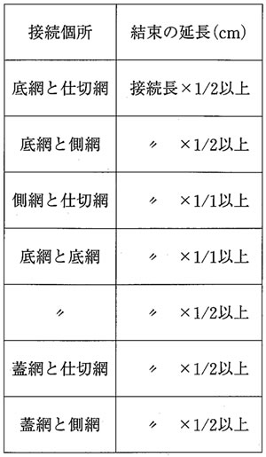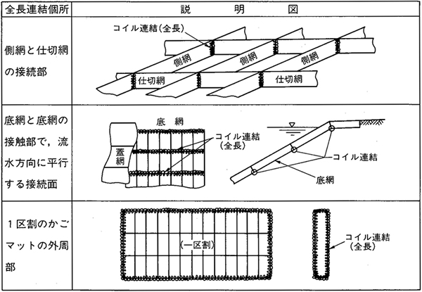 各接続部における連結の方法は、コイル方式とする。 コイルで結束する延長は、「側網と仕切網」および「底網と底網の接続部で、流水方向に平行する接続面」および「1区間のかごマット工の外周部」については、接続長の全長を結束するものとする(コイルの使用数=2本/m)。 その他の部分は接続長の1/2以上(コイルの使用数=1本/m)を結束すること。 結束終了時のコイルの両端の線端末は、内側に向けるものとする。