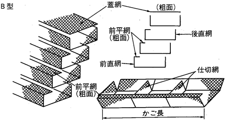 多段積み護岸とは、鉄線かごを連結して一体構造とし、かご網の中に詰め石を施した積上げ形式の護岸構造です。各段のかご網ユニットには、経済性を考慮して開発されたA型、B型が一般的に用いられています。当社ではB型を製造販売しております。C型は底網、蓋網が重複するうえ、かご網とかご網の連結作業に手間がかかって、工費がかさむタイプですので、根固工部等の特殊な個所のみに使われます。