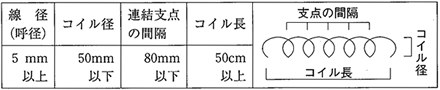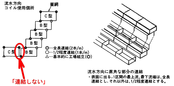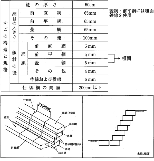 各接続部におけるコイルによる連結長(コイル使用数)は、底網やかご網構造のうちで表面に出ない箇所は接続長の1/2以上(コイルの使用数=1本/m)を結束し、他の接続箇所は接続長の全長(コイルの使用数=2本/m)を結束するものとする。