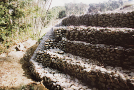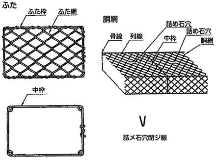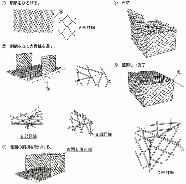 箱状のかごで、銅網、ふた網、中枠、骨線及び閉じ線からなります。